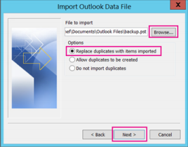 5. Browse to the .pst file you want to import. Under Options, choose how you want to deal with emails and contacts, then choose Next.