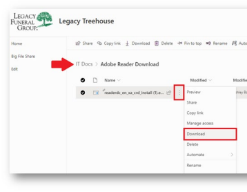 2. Navigate to the Treehouse > Document Libraries > IT Docs > Adobe Reader Download and click the three dots to choose the download option